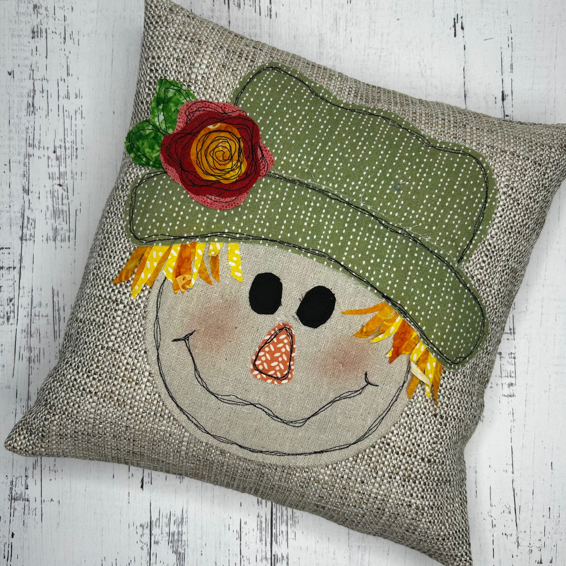 This fun Scarecrow was stitched piece by piece onto an high quality upholstery fabric. I stitch each of these pillows step by step in my home studio in Lincolnton, NC. This 12” x 12 “ pillow has an envelope back with an insert allowing you to change out pillows or inserts as you please. This pillow will add a colorful punch to your fall decor!!