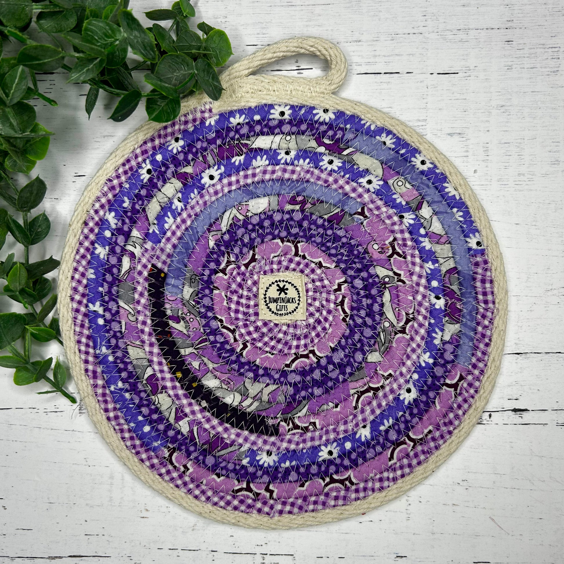 This sturdy and lovely trivet is 5/16 high quality cotton rope wrapped with cotton fabric and zig-zagged with cotton thread. I make these in my home studio in my NC home using an industrial zig-zag sewing machine.