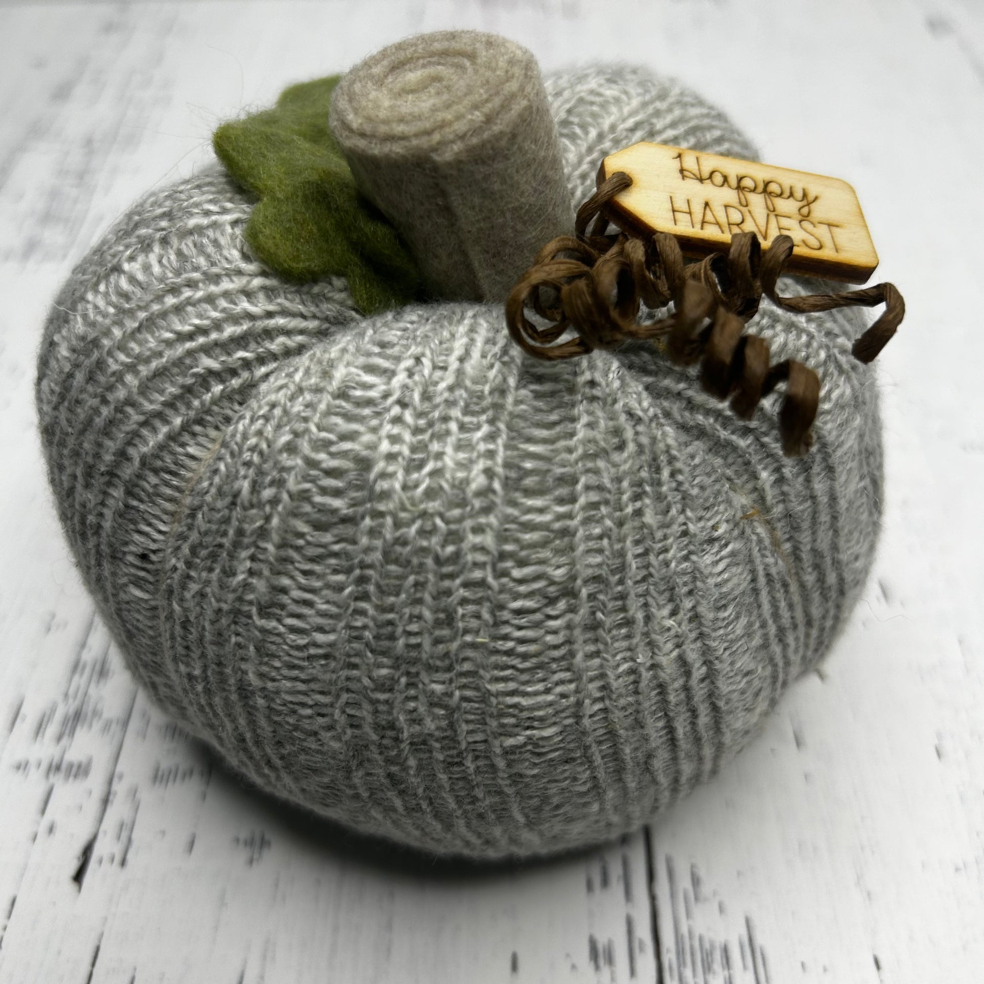 This sweet little knit pumpkin with a little Happy Harvest tag is the perfect addition to your fall decor. I stitched and stuffed this knit fabric and added the sweet leaves, curly tendrils and tag in my home studio in Lincolnton, NC.