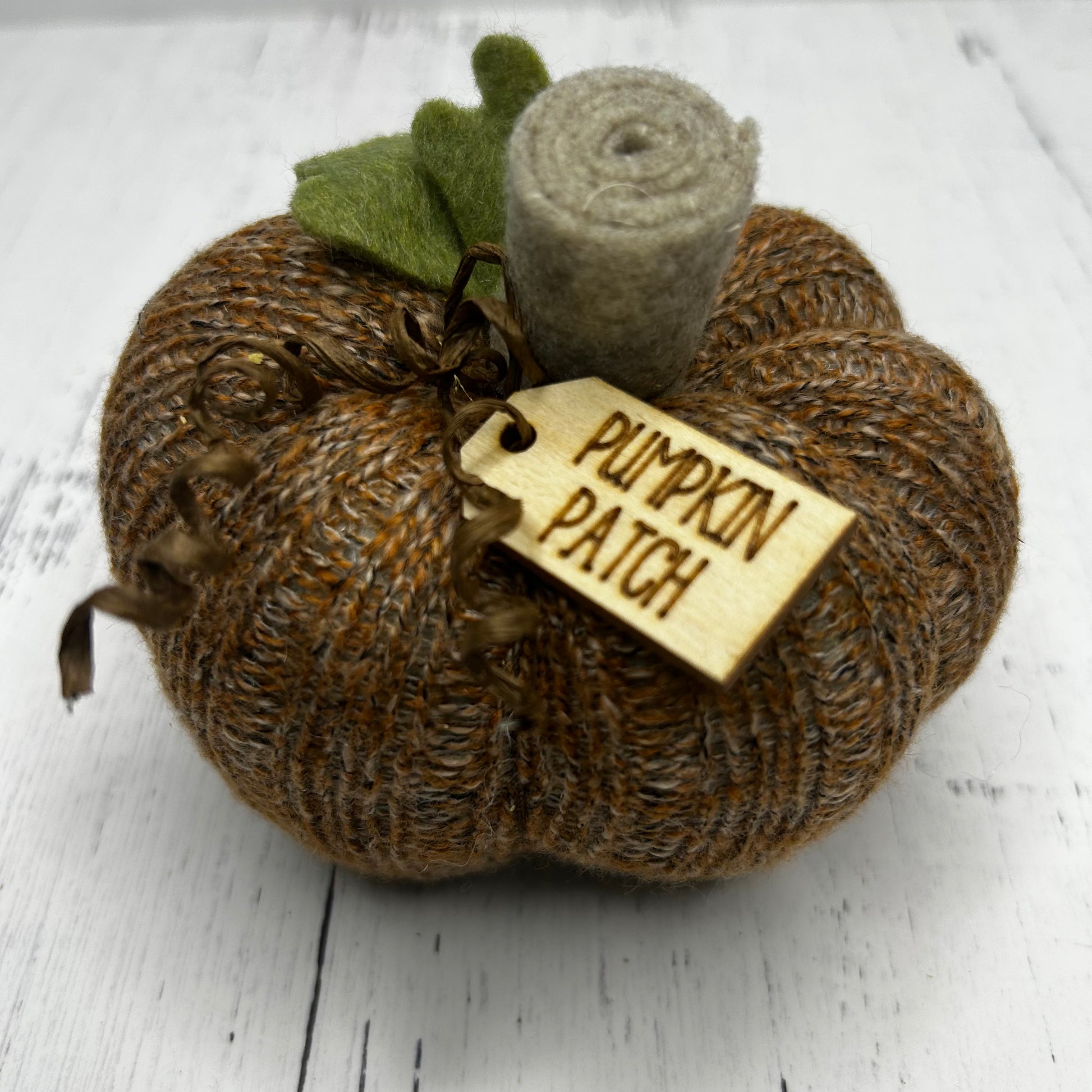This sweet little knit pumpkin with a little Pumpkin Patch tag is the perfect addition to your fall decor. I stitched and stuffed this knit fabric and added the sweet leaves, curly tendrils and tag in my home studio in Lincolnton, NC.
