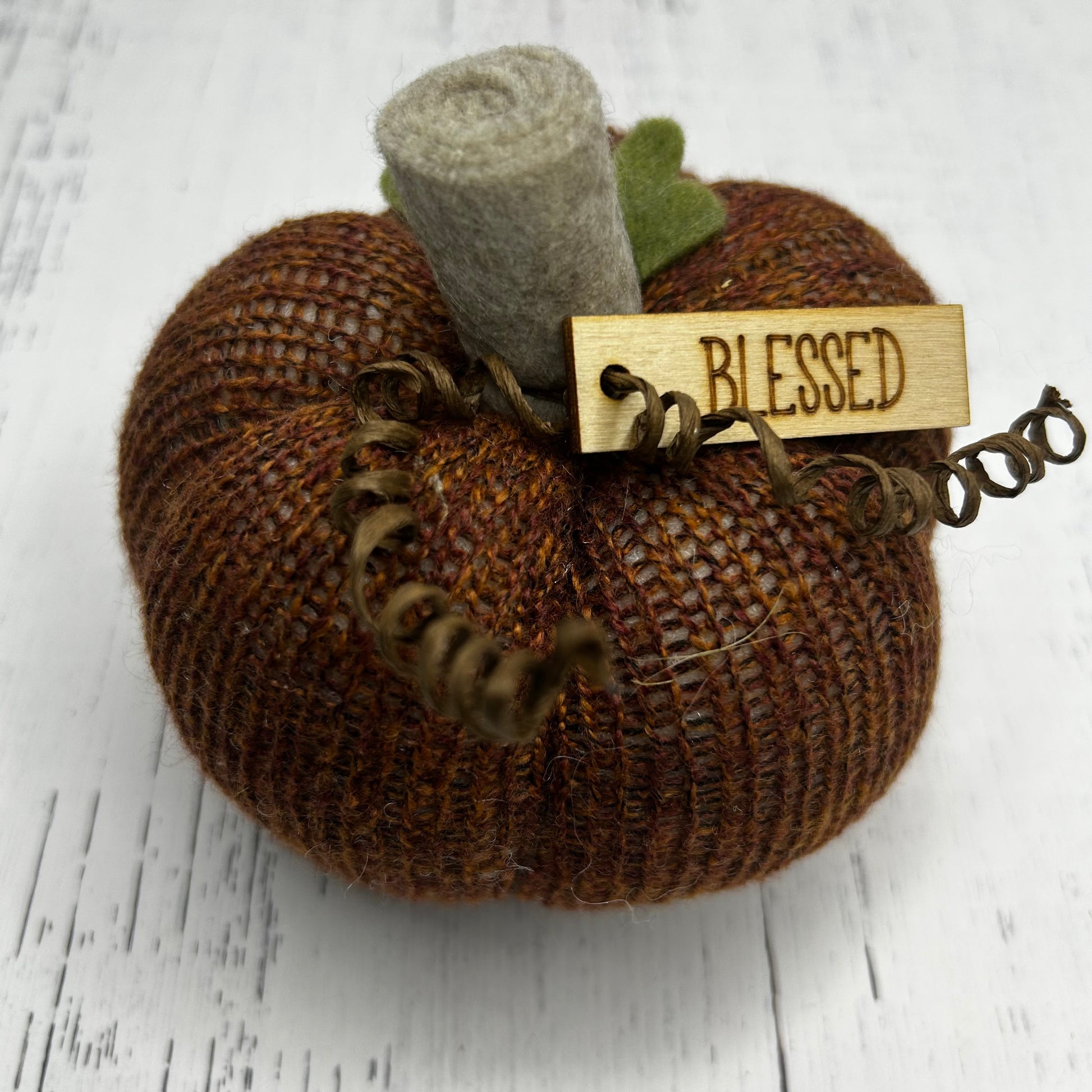 This sweet little knit pumpkin with a little Give Blessed tag is the perfect addition to your fall decor. I stitched and stuffed this knit fabric and added the sweet leaves, curly tendrils and tag in my home studio in Lincolnton, NC.